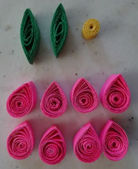 Con las tiras de papel realiza los siguientes enrollados: 2 marquises color verde, un círculo apretado pequeño color amarillo y 8 gotas color rosa (procura que al realizar las gotas no te queden tan apretadas).